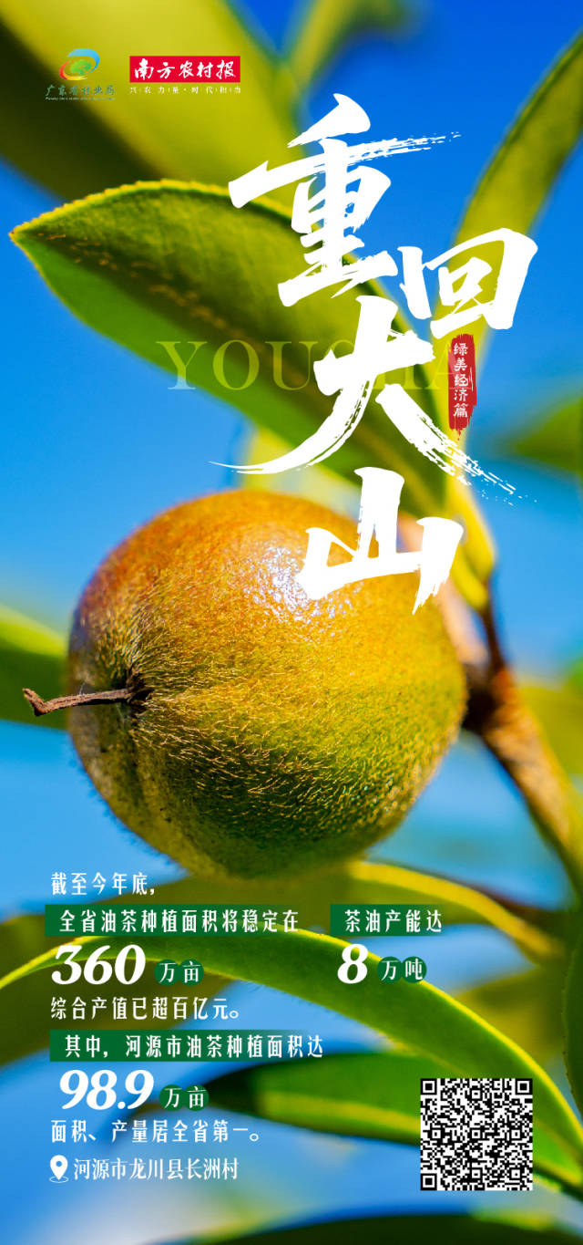 根据《广东省加快油茶产业发展三年行动方案(2023-2025)》,到今年年底,全省油茶种植面积将稳定在360万亩,茶油产能达8万吨,综合产值已超百亿元。其中,河源市油茶种植面积达98.9万亩,面积、产量居全省第一,综合产值超30亿元。小小油茶果,化身守护粤港澳大湾区粮食安全的“油瓶子”。