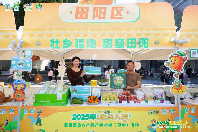 本次活动由粤桂协作工作队百色工作组、百色市农业农村局主办,涵盖农产品产销对接、品牌推介、文旅宣传、展销市集、互动快闪等多个环节,全面展现百色农业的多样魅力与产业活力。作为百色农业的重要代表,田阳“壮山农鲜”不仅在现场设置了特色展区,更通过美陈打卡、产品品鉴等方式,与深圳市民零距离互动,传递“农产万千,壮山领鲜”的品牌理念。