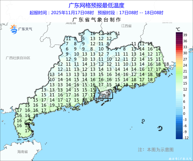 目前,北方一股强冷空气的前锋已到达南岭附近,预计它今天(17日)中午前后影响粤北,傍晚前后到达广州,半夜前后到达沿海。受强冷空气影响,18-19日,我省大部市县阴天,部分市县有小雨或零星小雨;各地气温将较17日明显下降,昼夜温差小。