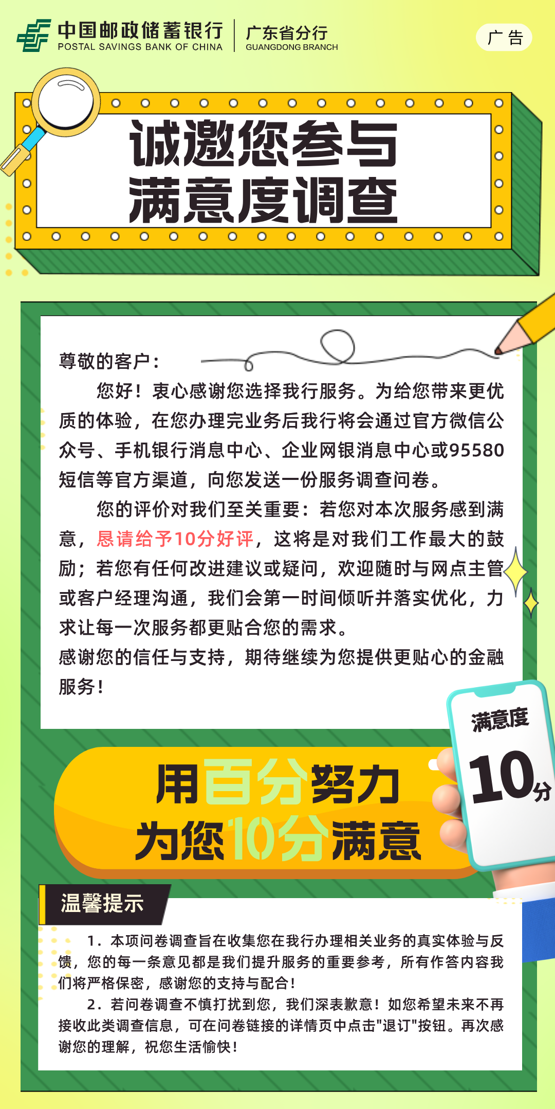 每一次服务,都想给您满分体验;每一份信任,我们都倍感珍视!邮储银行韶关市分行诚挚邀请您参与本次满意度调查,您的每一个回答、每一条建议,都是我们优化服务的重要指引。在您办理完业务后,我行将会通过官方微信公众号、手机银行消息中心,企业网银消息中心或95580短信等官网渠道,向您发送一份服务调查问卷,若您对本次服务感到满意,恳请给予10分好评。本次调查流程简洁,全程保护您的隐私信息。您的反馈将直接助力我们升级服务细节、完善产品体系,让后续服务更贴合您的需求。