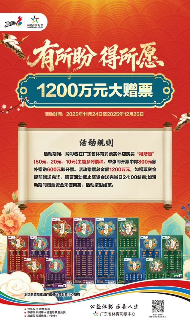 岁末将至,福运临门。近日,体育彩票顶呱刮“得所愿”主题即开票正式登陆广东市场。为进一步回馈广大购彩者,广东省体育彩票中心将于2025年11月24日至12月25日开展“有所盼 得所愿1200万元大赠票”活动。