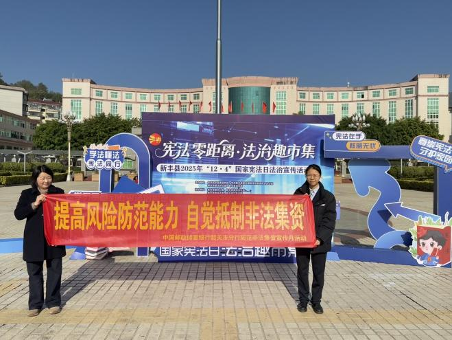 为了进一步加强社会公众防范非法集资意识,提高金融辨别能力,营造安全健康金融环境。近日,邮储银行新丰县支行利用2025年“12.4国家宪法日法制宣传活动”契机,组织工作人员到新丰县政府广场开展防范非法集资宣传活动。