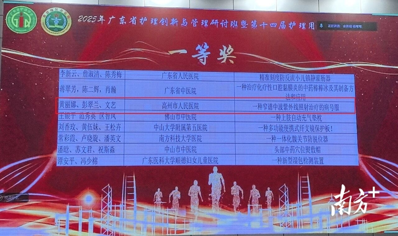 南方农村报讯 (通讯员林楚娴)近日,由广东省护理学会、岭南南丁格尔护理研究院联合主办,南部战区总医院承办的“广东省护理创新关键技术与创新进展学习班暨第十四届护理用具创新大赛”在广州顺利举办。高州市人民医院自主研发的“一种用于窄谱中波紫外线照射治疗的病号服”,在此次大赛中荣获一等奖,同时入选广东省岭南南丁格尔护理研究院创新档案成果库,并于大赛会议展厅进行同步展示。