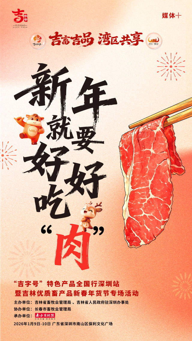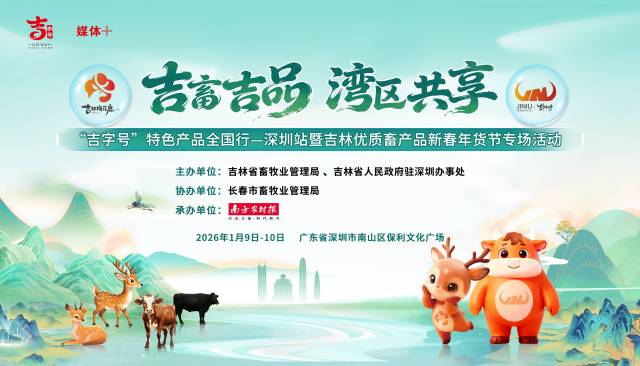吉畜吉品,湾区共享。2026年1月9日-10日,“吉字号”特色产品全国行——深圳站暨吉林优质畜产品新春年货节专场活动将于广东省深圳市南山区保利文化广场隆重举行。本次活动由吉林省畜牧业管理局、吉林省人民政府驻深圳办事处主办,长春市畜牧业管理局协办,南方农村报社承办。