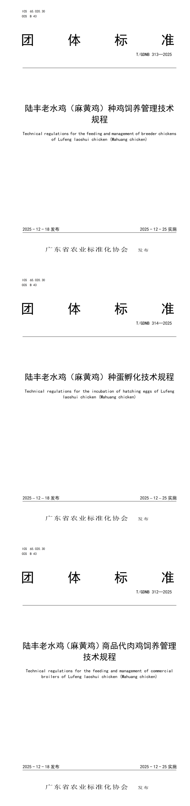 近日,广东省农业标准化协会正式发布《陆丰老水鸡(麻黄鸡)种鸡饲养管理技术规程》《陆丰老水鸡(麻黄鸡)种蛋孵化技术规程》和《陆丰老水鸡(麻黄鸡)商品代肉鸡饲养管理技术规程》三项团体标准(标准编号:T/GDNB 312-2025、T/GDNB 313-2025、T/GDNB314-2025)。这是国内首次以陆丰老水鸡养殖方式为范本,出台全产业链技术规范,也标志着陆丰老水鸡特色养殖模式,正式告别“经验养殖”模式,迈入标准化、品牌化发展新赛道。