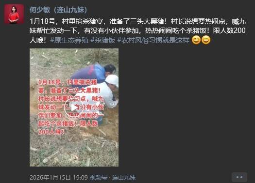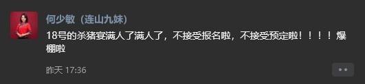 “满人了,满人了,不接受报名了!爆棚啦!”在清远连山,“连山九妹”何少敏在抖音、微信发起了杀猪宴活动,吸引了来自五湖四海的网友相聚吃年猪;