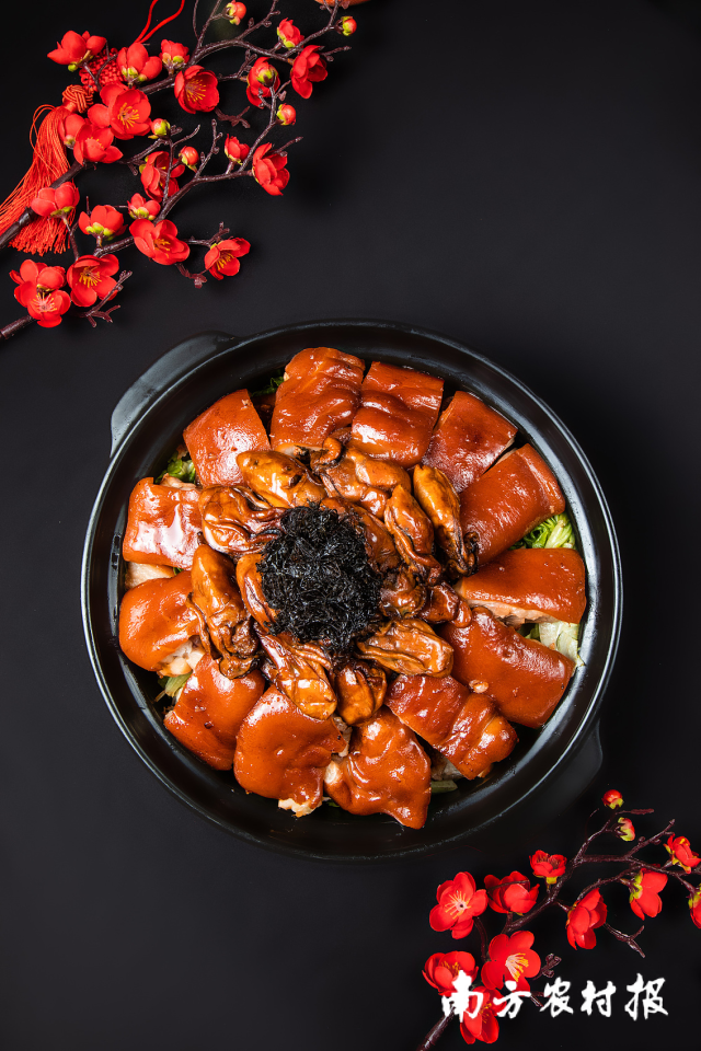 蚝豉焖猪手:蚝豉寓意“好市”,猪手象征“横财就手”,搭配以生菜、冬菇讲究“生财、团圆”。作为春节"意头菜"的代表作,吃蚝豉焖猪手从经商群体追捧的符号,进化成家家户户年夜饭必行的仪式。凭借丰富的材料搭配、无与伦比的吉祥寓意,蚝豉焖猪手已成为广东预制年菜中的重要款式,在家即可复刻酒楼风味,新的一年祝福与美食同在。