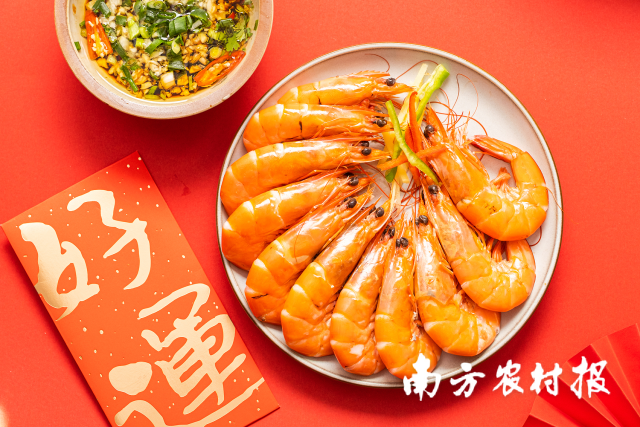 白灼南美白对虾:在春节的餐桌上,排列整齐的白灼大虾无比诱人。粤语中“灼”意为“快煮”,白灼虾以其对食材、火候的精准要求,诠释了粤菜对食材本味的完美追求。南美白对虾是中国养殖量最多的虾类,也是广东优势水产品种,在“以火驭鲜”的烹饪智慧中,一条条肥硕饱满的大虾把“鲜甜”演绎到极致。