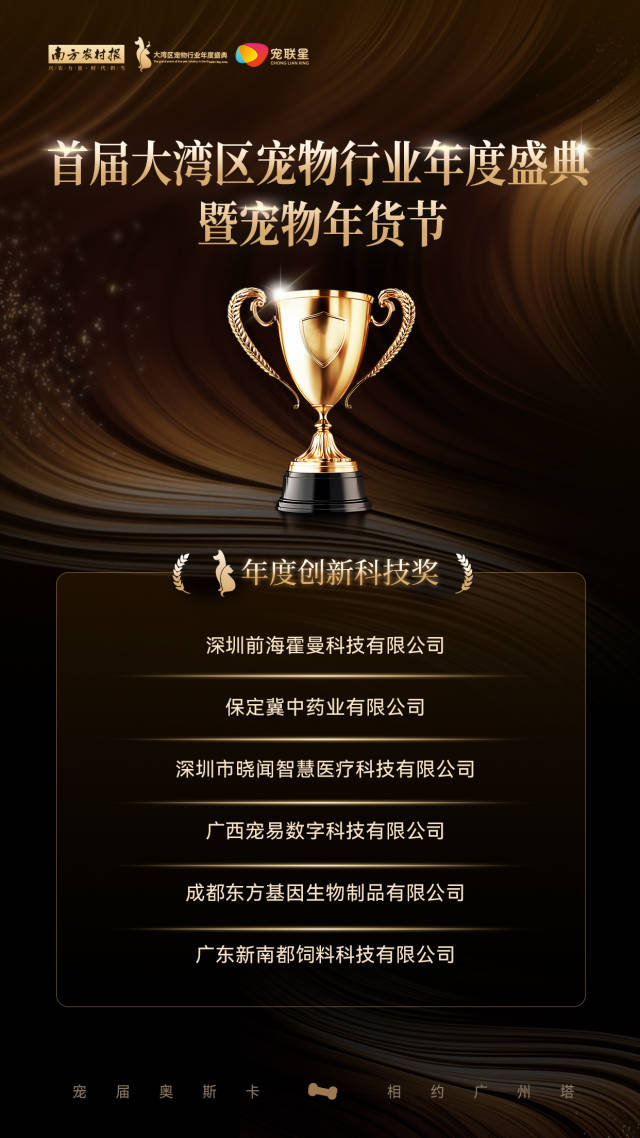 “年度创新科技奖”颁给了深圳前海霍曼科技有限公司等6家企业,表彰他们在宠物食品、宠物药品和医疗技术、智能设备等领域的技术突破和创新实践。