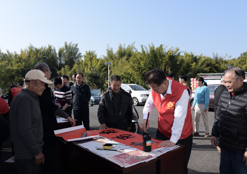 活动现场,红纸铺展、墨香四溢。3位书法爱好者凝神挥毫、笔走龙蛇,寓意吉祥的春联、一个个遒劲有力的“福”字跃然纸上。既有“户纳千祥,门迎百福”的传统寄语,也有贴合客家文化的美好寄语,字里行间满是对新年的期盼、对乡亲们幸福生活的祝愿。