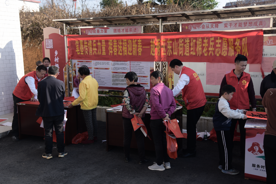 村民闻讯纷纷赶来,围站桌旁驻足观赏,有的挑选心仪联句,有的请书法家量身定制,欢声笑语不断。拿到带着墨香的春联和福字,大家脸上洋溢着幸福笑容,不住称赞“手写春联有温度,年味更足”。工作队员主动搭手,帮忙铺纸研墨、晾晒春联,将饱含祝福的春联一一送到村民手中,还与乡亲们拉家常、问近况,叮嘱大家平安过年。