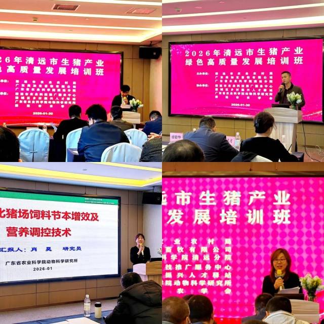 为深入实施“百千万工程”和乡村振兴战略,促进科研与生产深度融合,进一步提升清远地区生猪养殖技术水平和疫情防控能力,助力构建清远地区全方位、立体化生猪产业体系。1月30日,广东省农业科学院清远分院组织举办了2026年清远市生猪产业绿色高质量发展培训班。本次培训由清远分院副主任董春琳主持,清远市农业农村局总畜牧兽医师黄军龙、清远市养殖协会廖毅会长莅临现场并致开幕词。培训班特邀肖昊研究员、宋长绪教授、樊福好研究员、别又才博士、马建升总经理等多位行业专家授课交流。