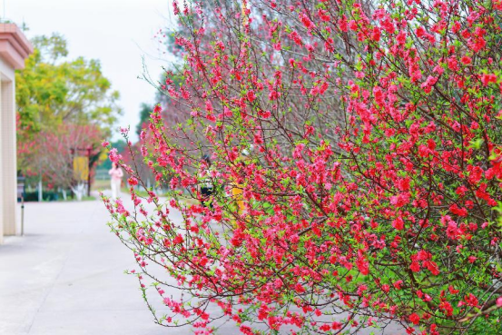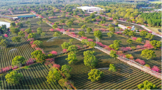 英德的茶园里,新春的花海正悄然绽放,茶绿与花红相映成趣,勾勒出别样的田园景致。