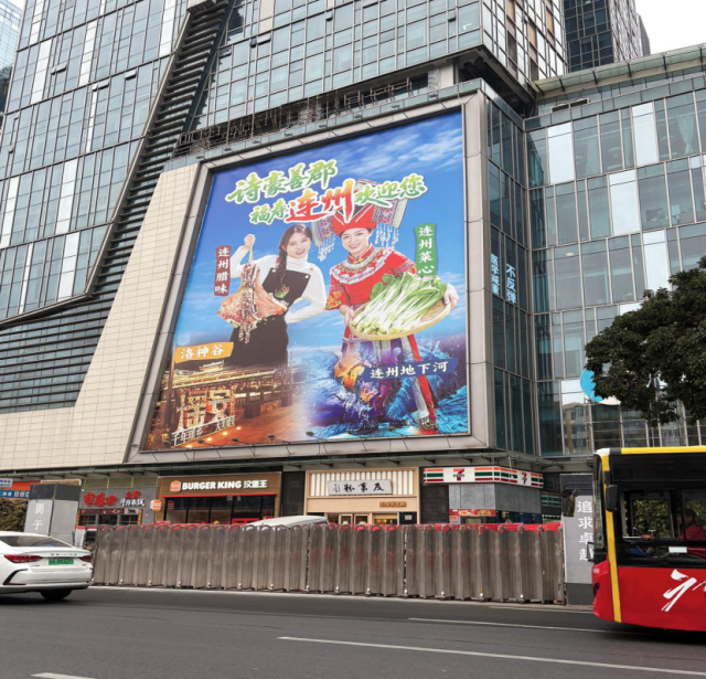 诗豪善郡,福寿连州欢迎您!近日,广州天河区高志大厦上的一则宣传广告格外醒目,连州带着地道的美食与特色文旅资源亮相羊城街头,向大湾区乃至全国市民发出了“到连州过大年”的盛情邀约。