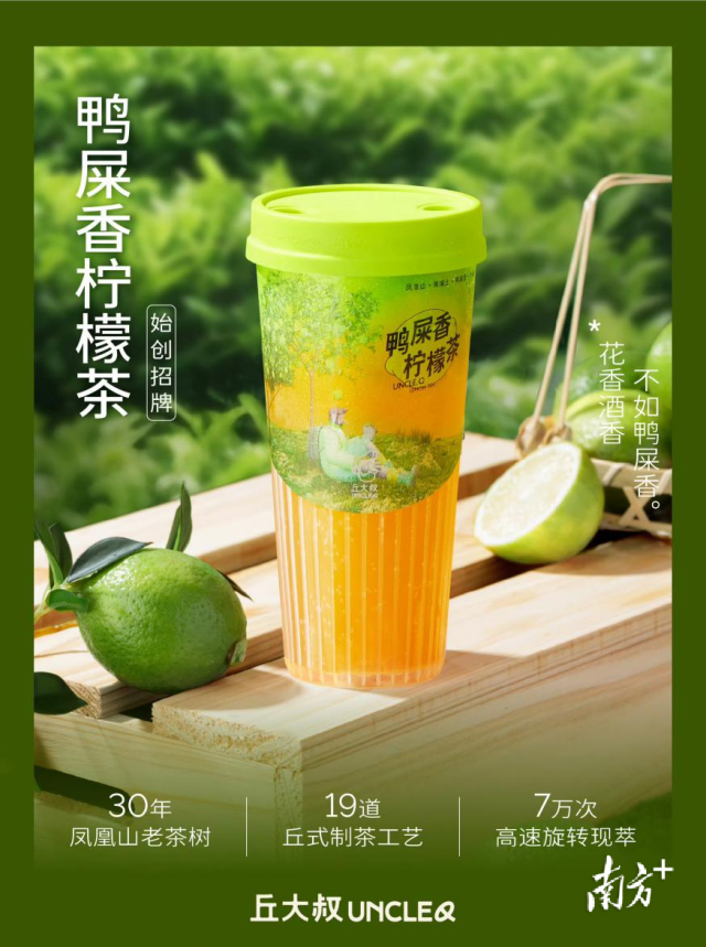 源自广东的柠檬茶品牌“丘大叔”将地方茶种与水果融合推向极致。2018年,丘大叔推出业内首款以“鸭屎香”凤凰单丛茶为底的柠檬茶产品,成功引爆市场,开创了新派柠檬茶的潮流。数据显示,仅半年时间,这一单品的销量便突破1.2亿杯。“鸭屎香”也从潮汕茶农口中的“土名”,一跃成为各大茶饮品牌的“宠儿”。