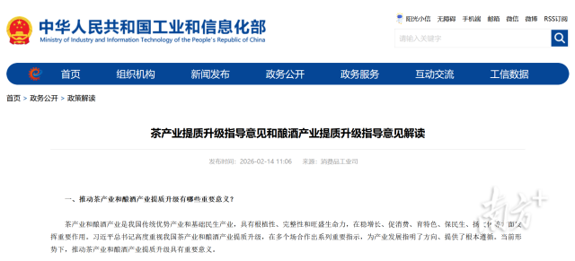 2月14日,工业和信息化部联合商务部、文化和旅游部、市场监管总局、中华全国供销合作总社印发《茶产业提质升级指导意见(2026—2030年)》,联合人力资源社会保障部、市场监管总局印发《酿酒产业提质升级指导意见(2026—2030年)》,加快推动茶产业和酿酒产业高质量发展。