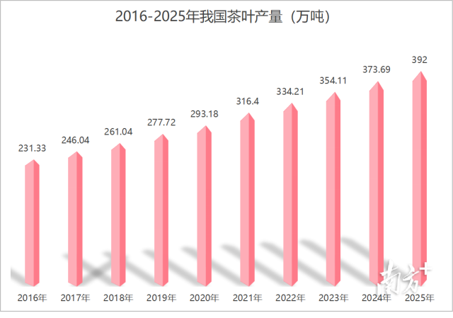 2月28日,国家统计局发布2025年国民经济和社会发展统计公报。数据显示,2025年,我国茶叶产量392万吨,增产4.8%。近十年,我国茶叶产量逐年上涨。