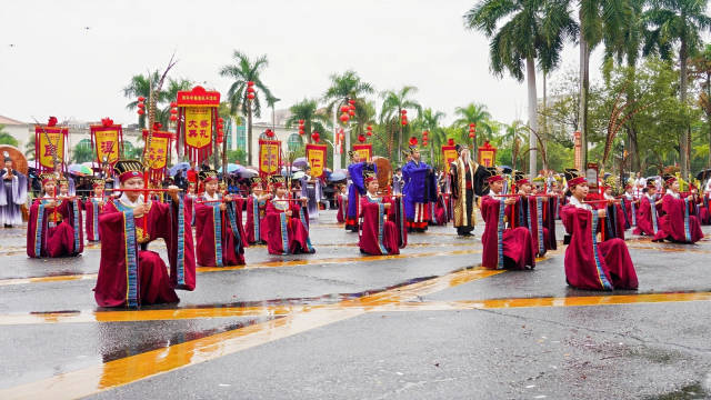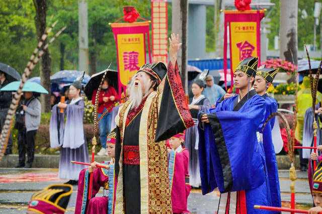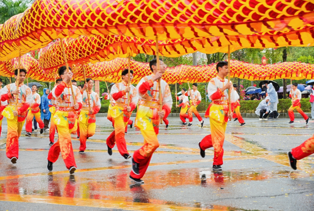 “古韵儒风扬国学”方阵文气沛然,学子队、主旗、黄灯笼、旗幡队、典礼官、主事官、六佾舞、十二哲表演队百余人身着古服,以编钟古琴为引,诵读孔子名篇、演绎六佾古礼,尽显“崇德之城、文明德庆”的深厚底蕴。“龙腾马跃启新程”方阵活力满满,《花灯元夕》《柑娃跃舞》《龙舞德庆》等表演接连上演,璀璨花灯与激昂鼓点同频共振,百米巨龙与七彩祥凤相映成趣,演员冒雨腾跃,观众雨中欢呼,非遗之美与全民之乐完美交融,充分展现了德庆人民自强不息、奋斗进取、勇毅前行的精神风貌。