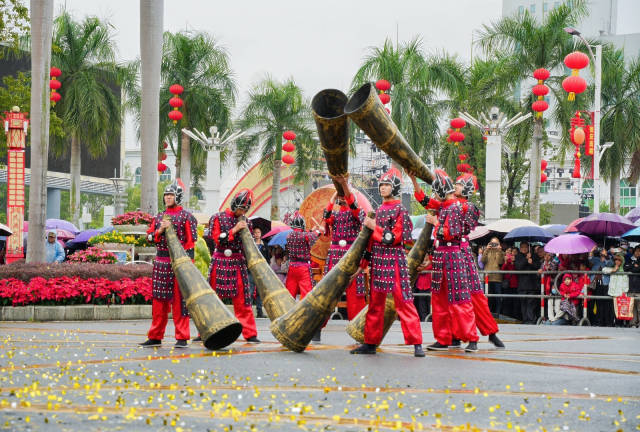 上午9时30分,德庆县崇德广场鼓乐齐鸣、醒狮腾跃,朝气蓬勃的骏马奔腾闹元宵表演拉开民间艺术大巡游序幕。尽管雨丝纷飞,地面湿滑,但演员们依旧精神抖擞,游客市民也撑着各色雨伞驻足围观,热情丝毫未减,掌声与喝彩声在雨幕中久久回荡。三大主题方阵依次登场,每一个方阵都承载着德庆的文脉底蕴与民俗风情。