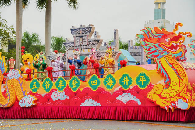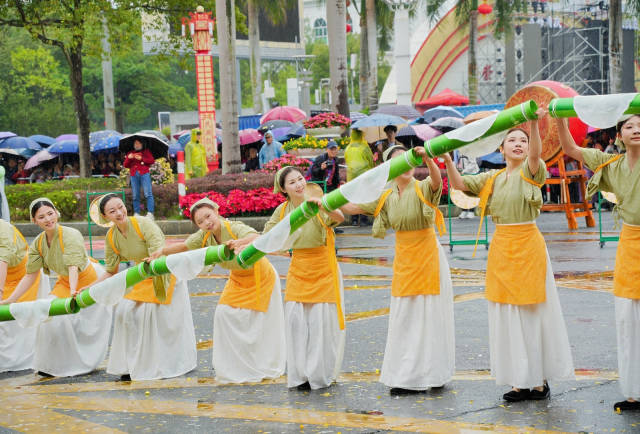 首个“非遗传承展新姿”方阵,由德庆农文旅融合发展主题花车领衔。花车巧妙融入国家级非遗“悦城龙母诞庙会”与德庆学宫等特色元素,旗阵队、灯笼队、水族队紧随其后,将德庆花灯民俗与水乡文化的韵味展现得淋漓尽致。本土非遗表演采茶歌《感恩茶颂》、舞蹈《竹旌引瑞》诉说乡愁,深情演绎文化根脉。连南民族歌舞团、连滩飘色队跨城献艺的《母仪祥鼓》《福佑飘色》,让岭南非遗瑰宝绽放光彩。