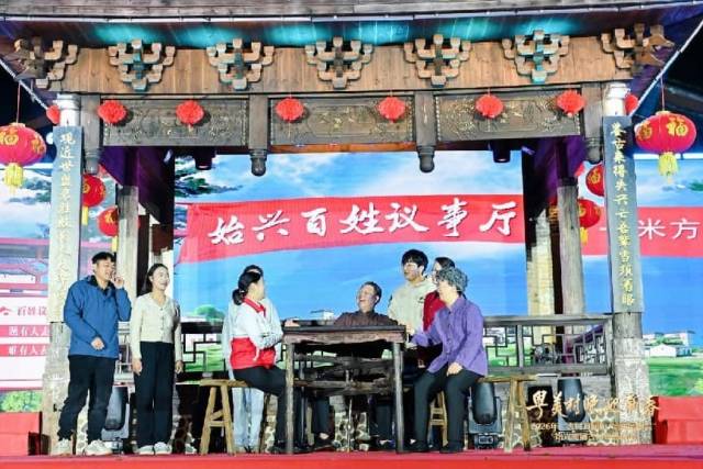 “三国的县衙在哪里,唐相的故乡在哪里,你家的围屋在哪里?”一首原创民谣《始兴始兴》,唱出了始兴的山美水美、人文之美,也唱出了在外游子对家乡的深深眷恋。小品《一米方桌》、音乐小品《未来社区·幸福+》,则取材于真实的乡村治理故事,将邻里间的家长里短、和美相处搬上舞台。