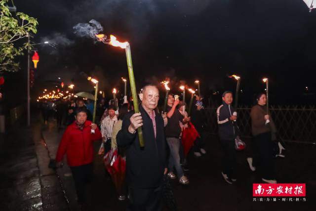 巨型火炬的火种引燃了第一支火把,象征性的火焰在参与者手中接续传递。顷刻间,成百上千支火把次第亮起,连缀成一条跃动蜿蜒的光带村民们与游客共同组成巡游队伍,手持火把,沿既定路线行进。