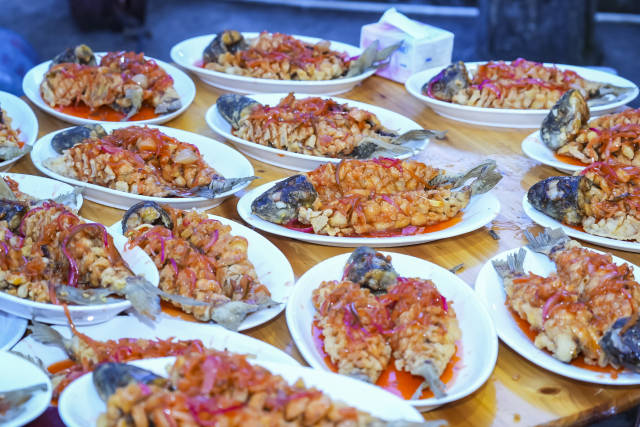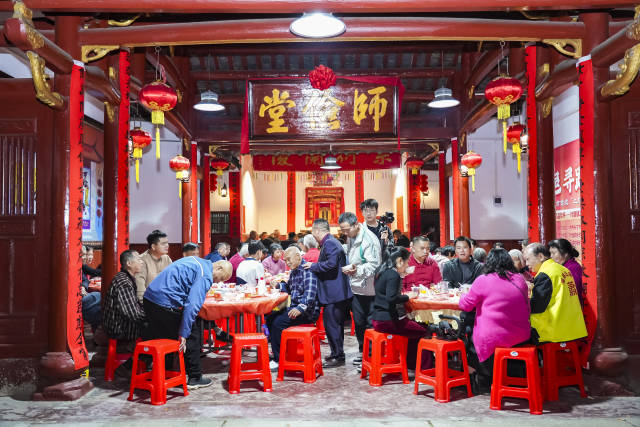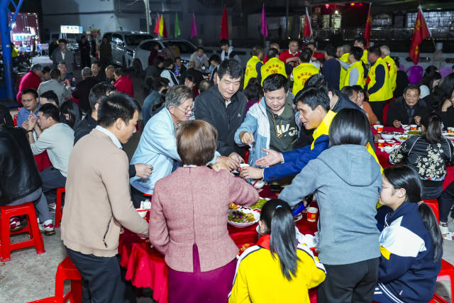 傍晚,围屋内设下传统客家宴席。数十张圆桌依次排开,地道客家菜被陆续端上,浓郁的菜香与热闹的谈笑声交织,构成了最具烟火气的暖灯记忆。