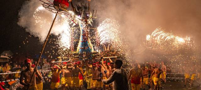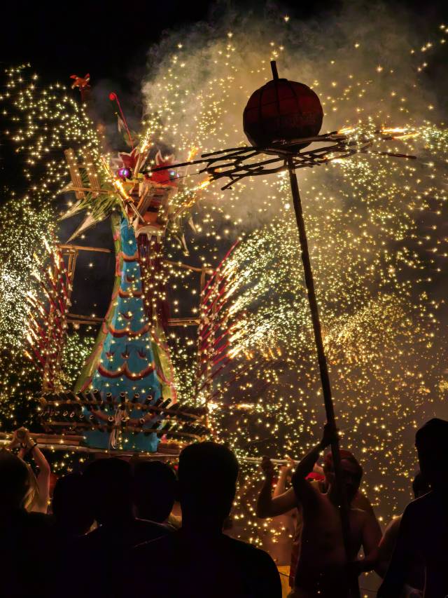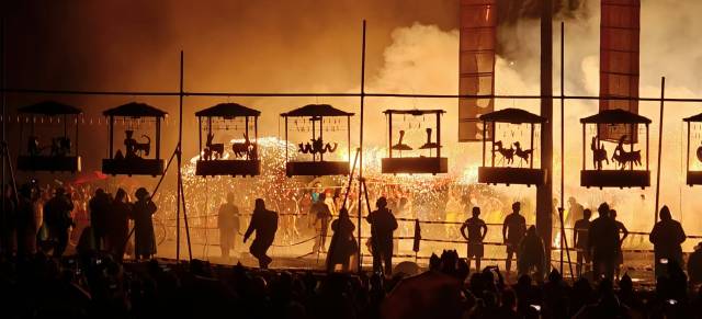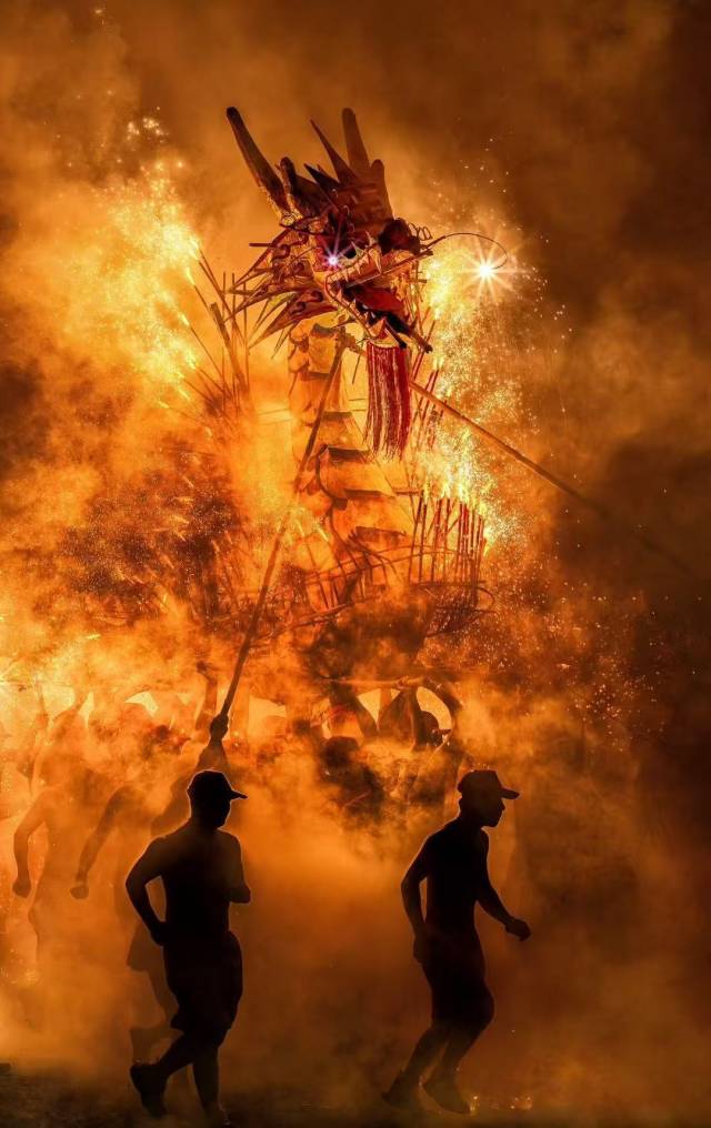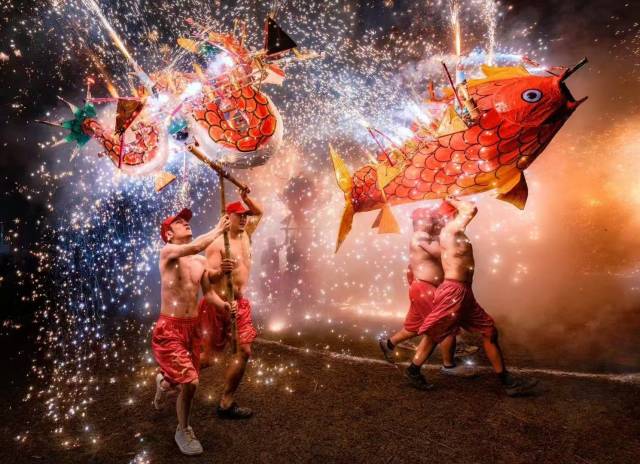 活动中,“鲤鱼吐珠”、“九龙吐珠”震撼亮相。现场,随着锣鼓声起,三条40米长的黄、红、青龙由上百名赤膊壮汉擎举入场,霎时间火光与烟雨交织,呈现出“人在火中舞,龙在雨中飞”的奇观。巨龙在火花中翻滚盘旋,龙身喷吐流火,龙鳞闪烁金光,恰似真龙遨游九天,呐喊声震耳欲聋。