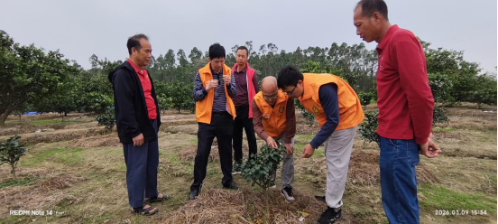 3月9日,石颈镇红橙种植户龙艳反映,石颈镇多个红橙种植户的红橙幼苗嫩芽出现发黄、干枯变黑症状,部分红橙幼苗落叶较为严重。接到反映后,廉江市农业技术推广中心杨成学主任带领副主任龙伟平及轻骑兵队员迅速赶赴现场。杨主任首先详细了解情况,询问了种植红橙前的土壤情况、周边农作物的用药种类,以及果农对红橙苗的施肥和用药管理情况。随后,他对病株进行了仔细检查,结合现场症状分析研判。