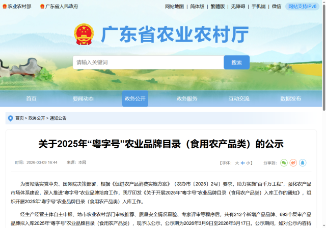3月9日,广东省农业农村厅官网发布《关于2025年“粤字号”农业品牌目录(食用农产品类)的公示》,经生产经营主体自主申报、地市农业农村部门审核推荐、质量安全情况查验、专家评审等程序后,共有212个新增产品品牌、693个复审产品品牌拟入库2025年“粤字号”农业品牌目录(食用农产品类),现予以公示,公示期为2026年3月9日至2026年3月17日。