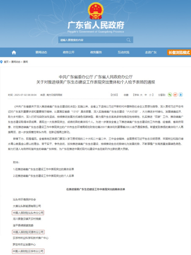 在为乡村添绿的同时,广东人保财险更以专业保险服务为绿美广东生态建设筑牢风险屏障。2025年,公司为全省3612万亩森林织密风险防护网,累计提供434亿元风险保障;同时积极推动森林保险产品创新,为地方优势特色林业产业保驾护航,承保2.4万亩花卉苗木、24万亩油茶、3136棵古树名木,累计风险保障金额达5.8亿元。凭借这份扎实的实践成果,公司连续三年入选广东绿色金融改革创新推广案例;汕头、河源、云浮三家分公司更因在护绿增绿工作中的亮眼表现,被评为“在推进绿美广东生态建设工作中表现突出的集体”,荣获省委、省政府通报表扬,成为金融行业助力生态建设的典范。