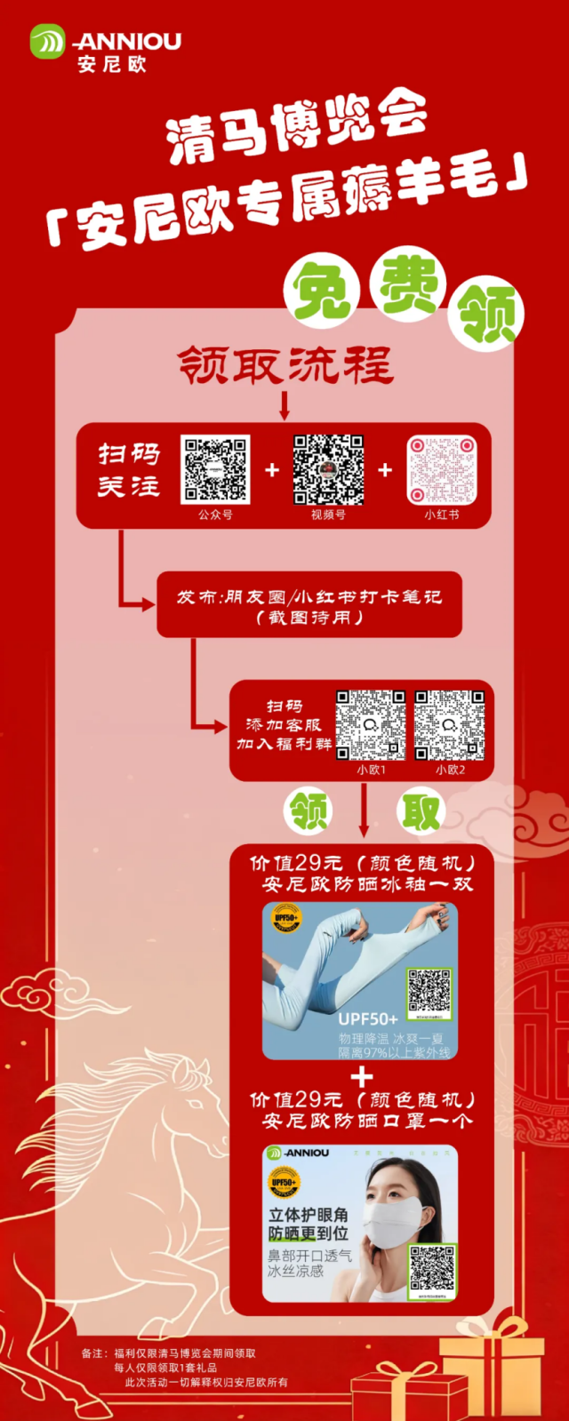 扫码关注“公众号+视频号+小红书”,发布朋友圈/小红书打卡笔记,扫码添加客服加入福利群,即可领取价值29元的安尼欧防晒冰袖一双或安尼欧防晒口罩一个。