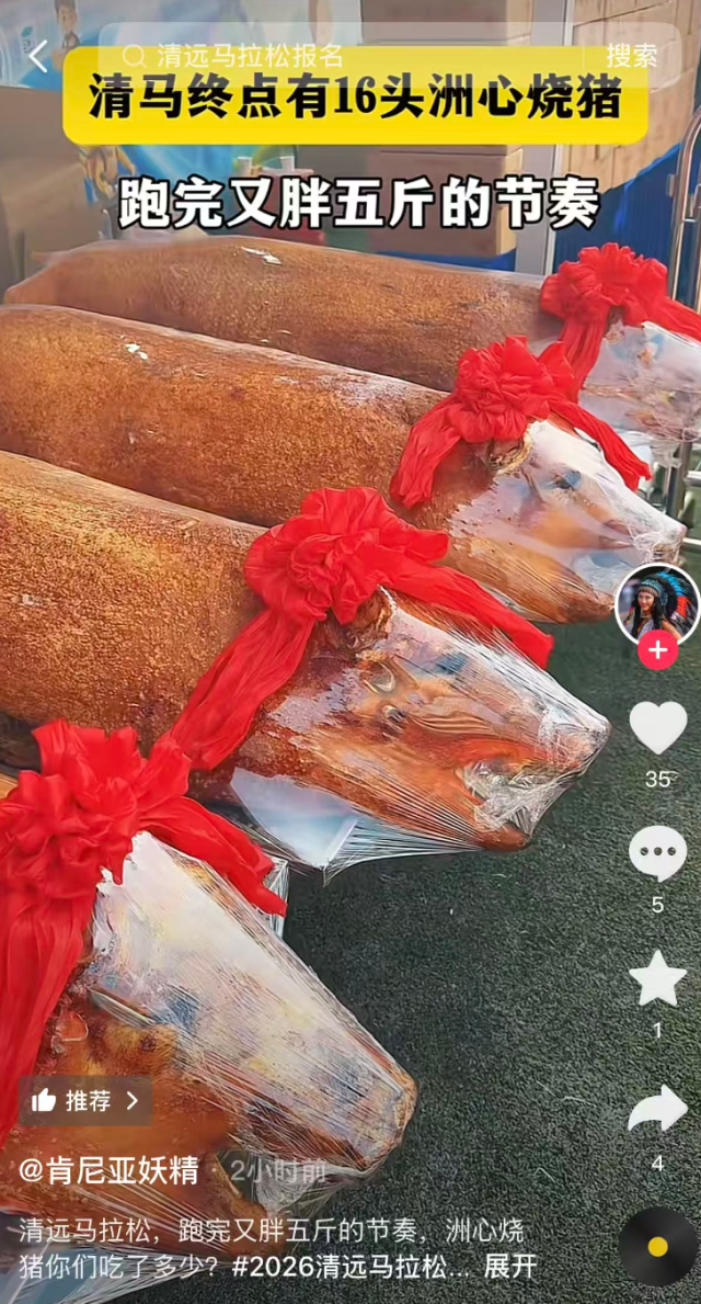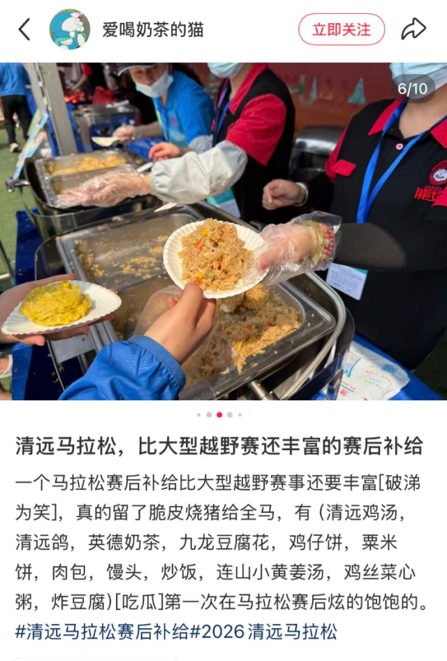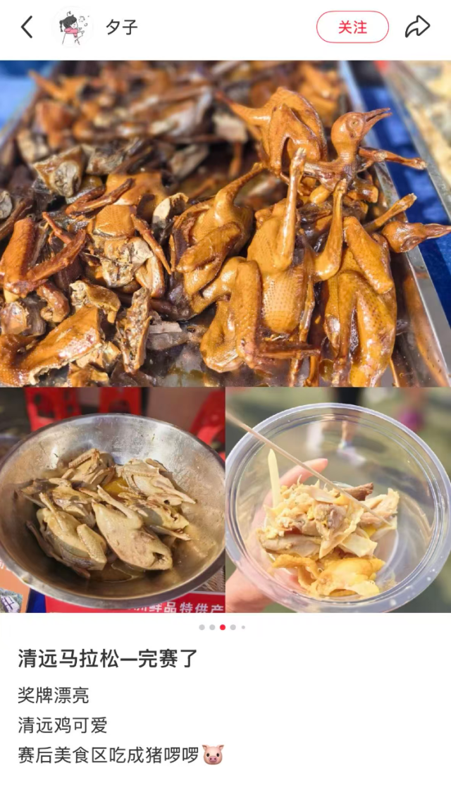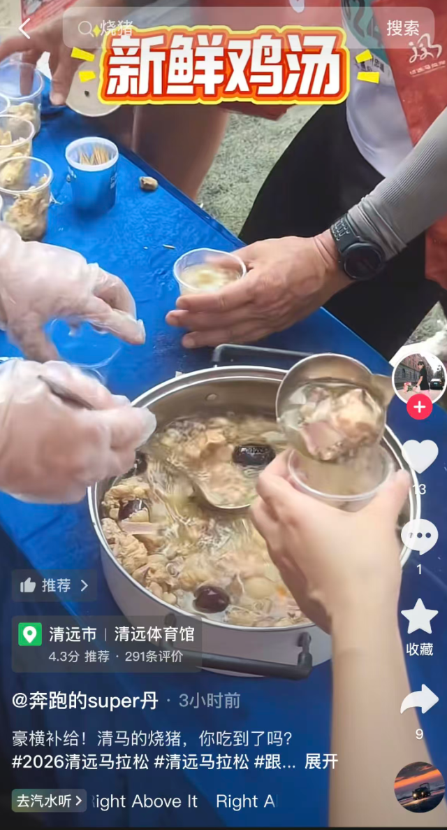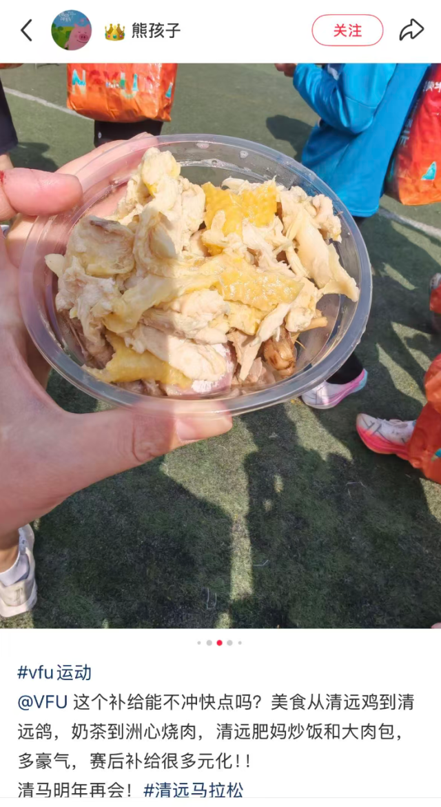 微博上@CH陈函 这位资深跑友直接晒出完赛感悟,语气里全是满足:“……赛道上能量胶盐丸充足,还有冰棍,连降温海绵都是清远鸡形状,赛后有烧肉、鸡粥等美食吃到饱!这是我第7次来了,忠实跑者免抽签,明年还来!”