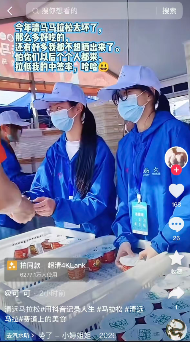 抖音网友@可可则说:“今年清马马拉松太‘坏’了,那么多好吃的,还有好多我都不想晒出来,怕你们以后个个人都来,拉低我的中签率,哈哈”