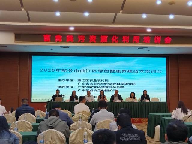 为全面夯实 2026 年曲江区畜牧兽医水产工作基础,强化重大动物疫病防控体系建设,提升畜禽养殖绿色化、标准化、规范化水平,推动全区畜牧水产产业高质量可持续发展,3 月 18 日上午,由韶关市曲江区农业农村局、广东省农业科学院动物科学研究所联合主办,广东省农业科学院韶关分院、广东智成食品有限公司共同协办的 “2026 年韶关市曲江区绿色健康养殖技术培训会” 在曲江区泉溪酒店顺利召开。曲江区农业农村局副局长杨志昌、省农科院动科所副所长马现永及专家团队、韶关分院驻点技术人员、全区重点养殖企业负责人、养殖技术骨干及养殖户代表等参加会议。