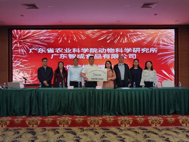 会上,省农科院动科所与广东智成食品有限公司举行科技成果转化合作签约仪式,并正式授予企业科技成果示范基地牌匾。双方将以此次合作为新起点,聚焦优质家禽品种选育推广、高效健康养殖模式示范、绿色养殖技术集成创新与应用等重点领域开展长期深度合作,加快科研成果落地转化,以科技赋能产业振兴,为曲江畜牧业高质量发展注入强劲动力。