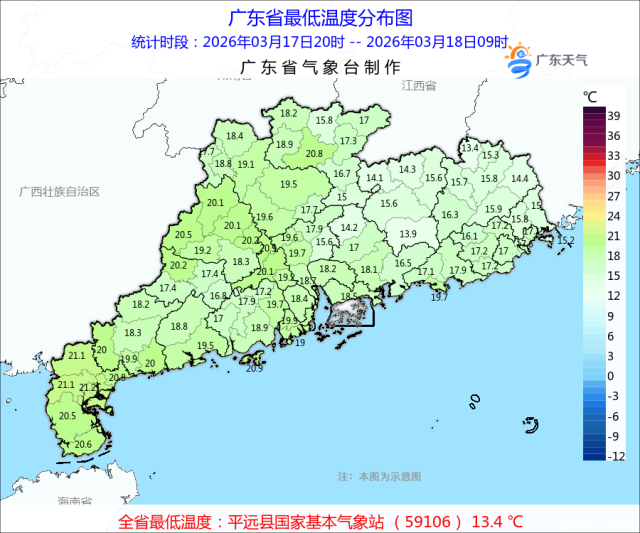 19日,韶关、清远北部市县多云到阴天,有分散小雨,其余市县多云间晴,局部有零星小雨。早晨部分市县有轻雾。受弱冷空气渗透影响,19日早晨粤北的偏北市县气温小幅下降,其余大部气温维持或小幅上升,19日早晨最低气温:韶关、清远北部、河源北部市县13~16℃,粤西沿海市县20~22℃,其余大部分市县17~20℃。20日,韶关、清远、肇庆北部市县多云到阴天,有小雨,其余市县多云,局部有零星小雨。最低气温:粤北的偏北市县15~17℃,珠江口附近到粤西沿海市县21~23℃,其余市县17~21℃。