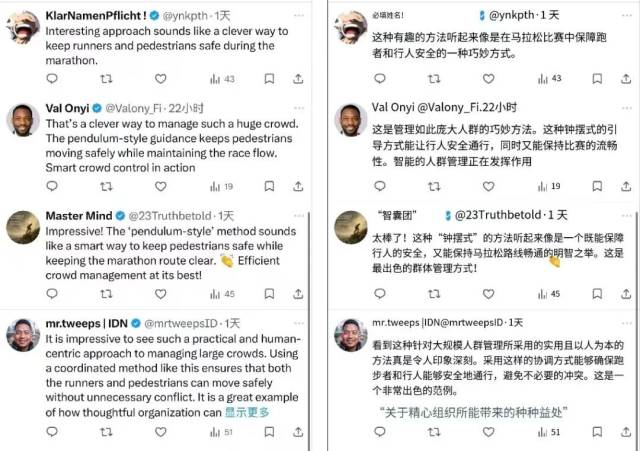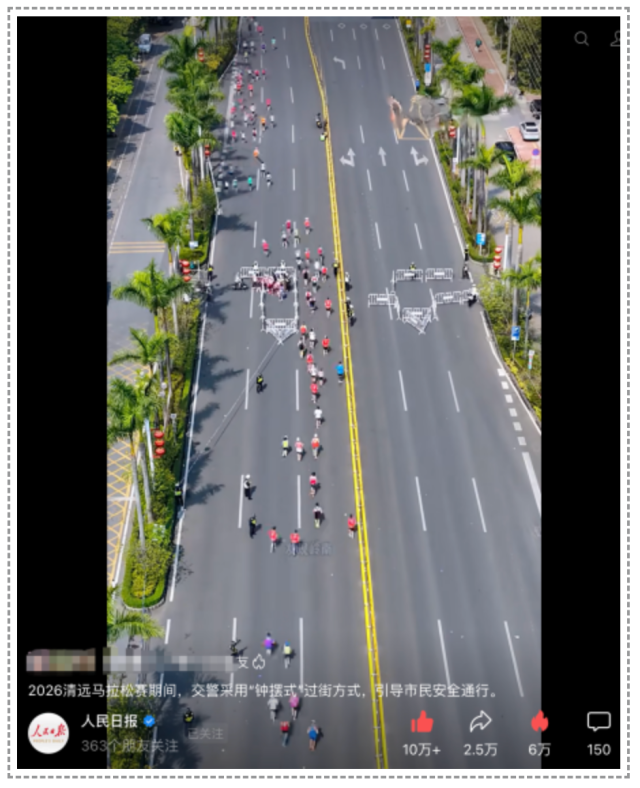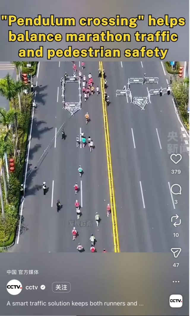 这套方法实现了:跑者经过时暂时管控确保赛事安全,跑者过后快速放行,满足市民出行需求,既保障了赛事顺畅,又没把市民的日常出行完全“卡住”。中央电视台也为这个思路点赞“‘钟摆式穿越’有助于平衡马拉松赛事交通和行人安全”。