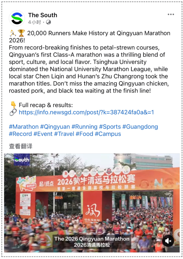 Pearl、Record GBA、Shenzhen Daily、Shenzhen Channel等媒体同步发声,把清远这个“中国城市的小智慧”传到了全世界。The South更是用《速度、激情与美食:2026清远马拉松点燃全城》为题,把这场赛事的“温度”讲给海外网友听。