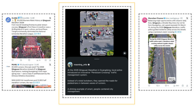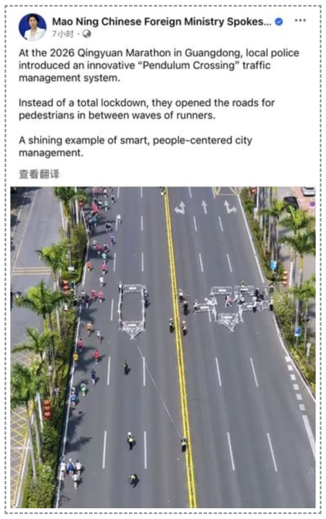 3月17日,外交部发言人毛宁转发点赞清远马拉松赛事“钟摆式过马路”的做法,评价它是“以人为本的智慧城市管理的典范”,肯定了清远的做法,即体现了中国基层的治理经验,也展现城市管理的温柔智慧。
