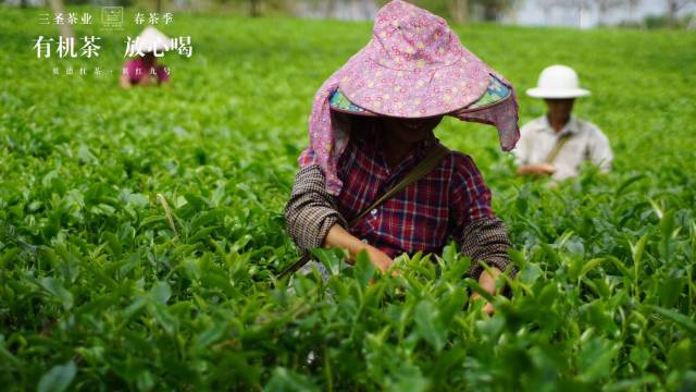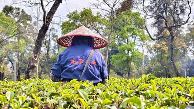 阳光明媚,春暖花开,广东鸿雁茶业有限公司员工在采摘春茶,在蓝色的工服点缀下,春色满园显得更加生机蓬勃。