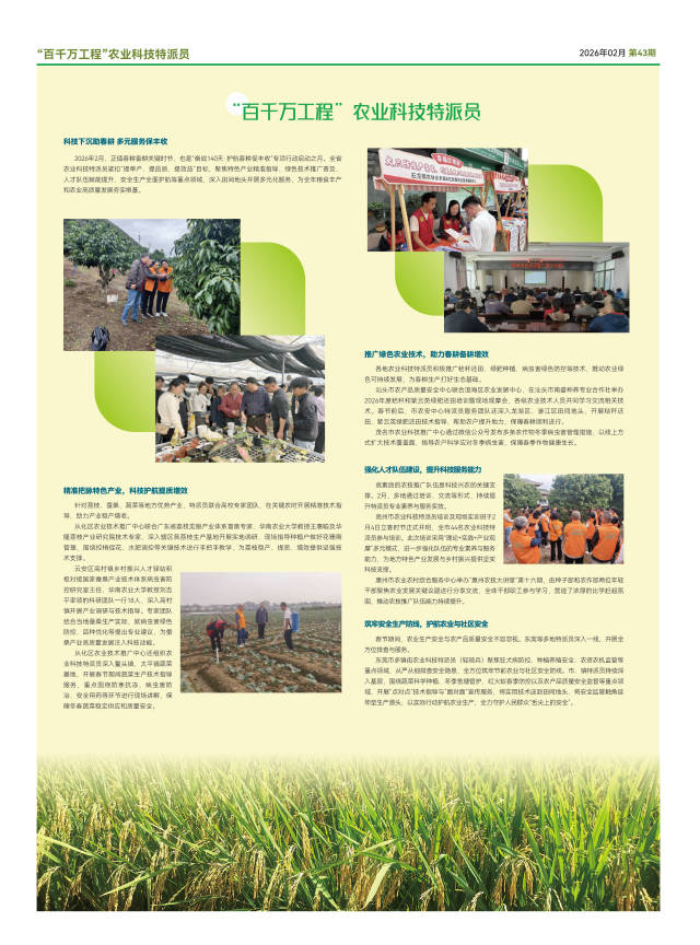 2026年2月,正值春耕备耕关键时节,也是“奋战140天·护航春耕促丰收”专项行动启动之月。全省农业科技特派员紧扣“提单产、提品质、提效益”目标,聚焦特色产业精准指导、绿色技术推广普及、人才队伍赋能提升、安全生产全面护航等重点领域,深入田间地头开展多元化服务,为全年粮食丰产和农业高质量发展夯实根基。