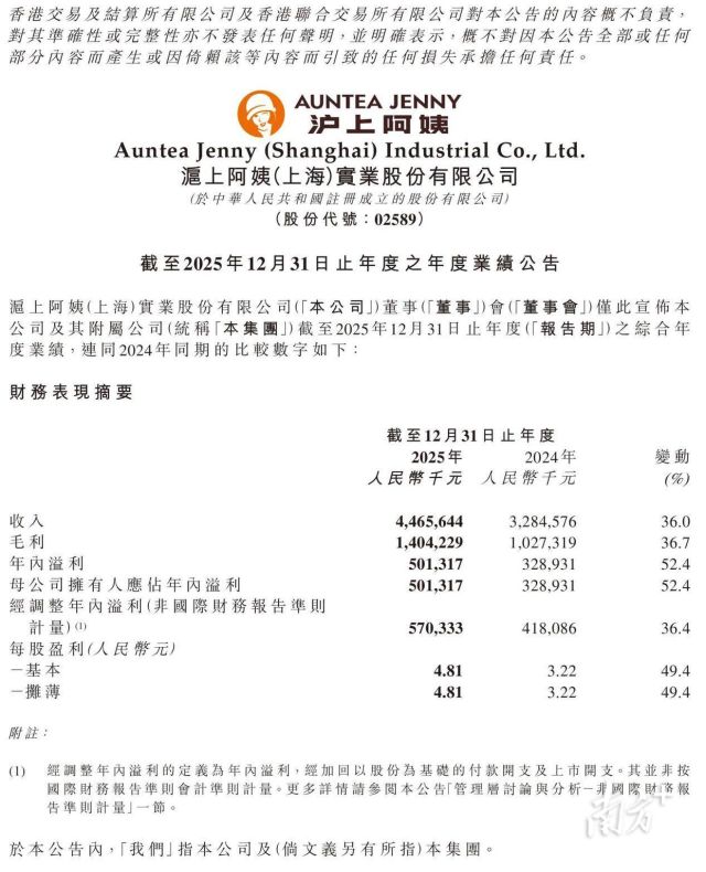 财报显示,沪上阿姨在2025年展现出强劲的增长动能。公司全年实现营业收入44.66亿元,同比增长36%;归母净利润5.01亿元,同比增长52.4%,单日盈利约137万元。
