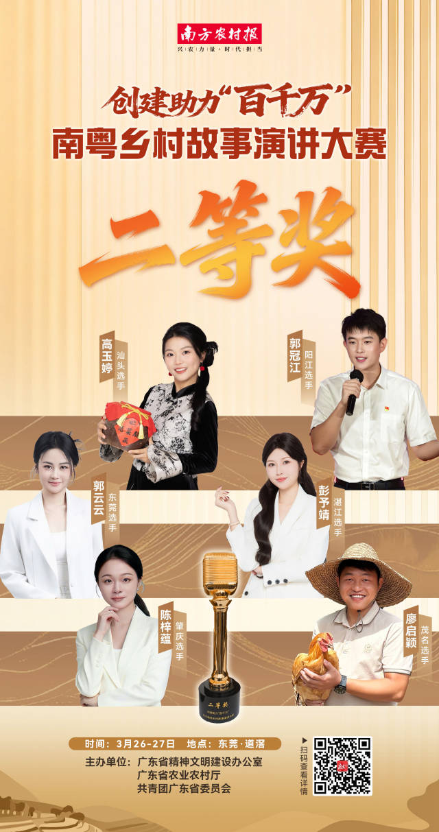 3月27日晚,创建助力“百千万”南粤乡村故事演讲大赛总决赛在东莞市道滘镇举行。经过激烈角逐,大赛最终产生特等奖1名、一等奖3名、二等奖6名、三等奖20名,现场还评选出优秀组织奖和最佳人气奖。