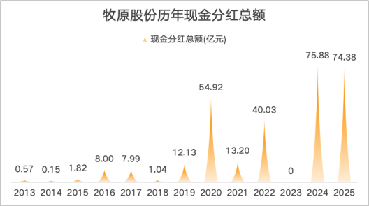 行业下行周期中,牧原股份年报拟派现金额同步收缩。公司抛出的2025年度利润分配预案显示,拟分红24.35亿元。如该议案通过,2025年全年现金分红总额为74.38亿元。相比之下,牧原股份2024年年报现金分红30.83亿元,全年合计派现75.88亿元。