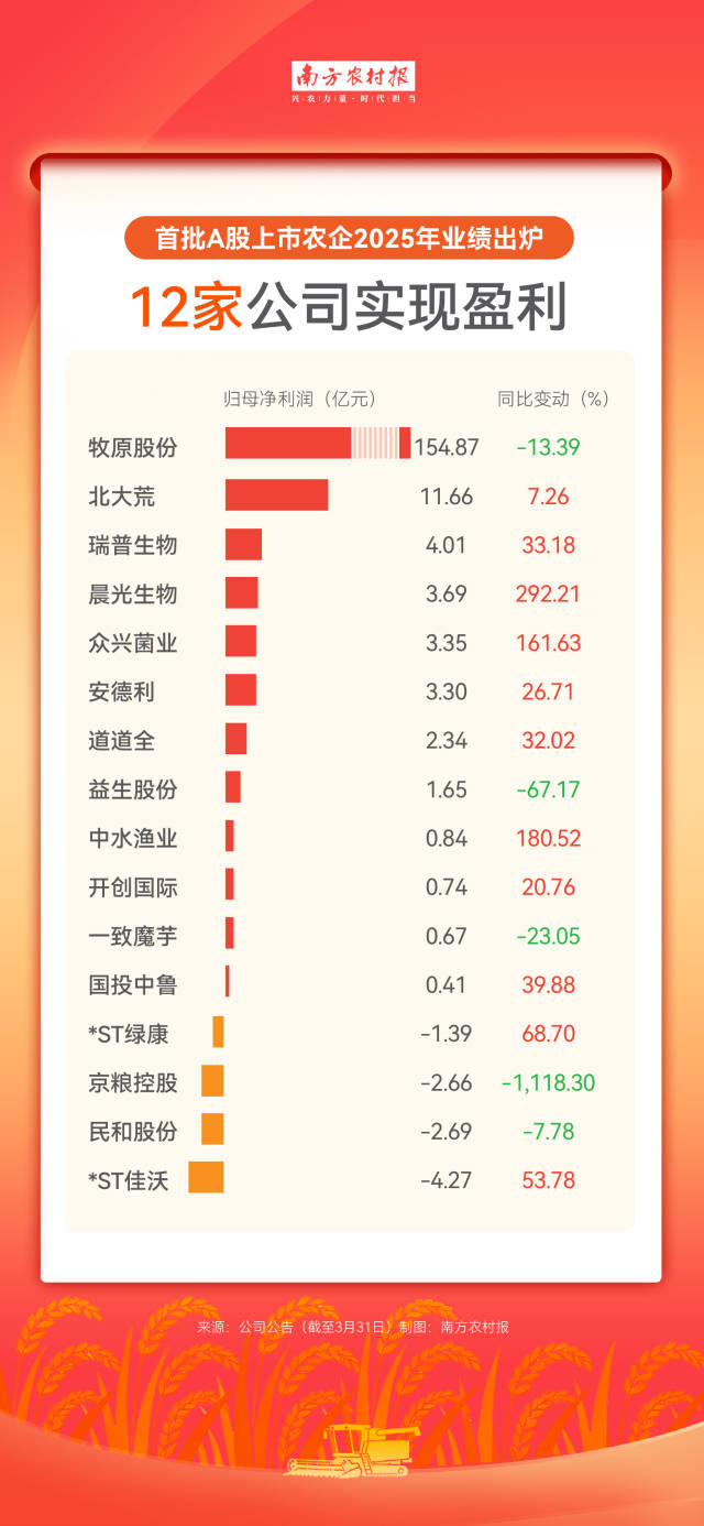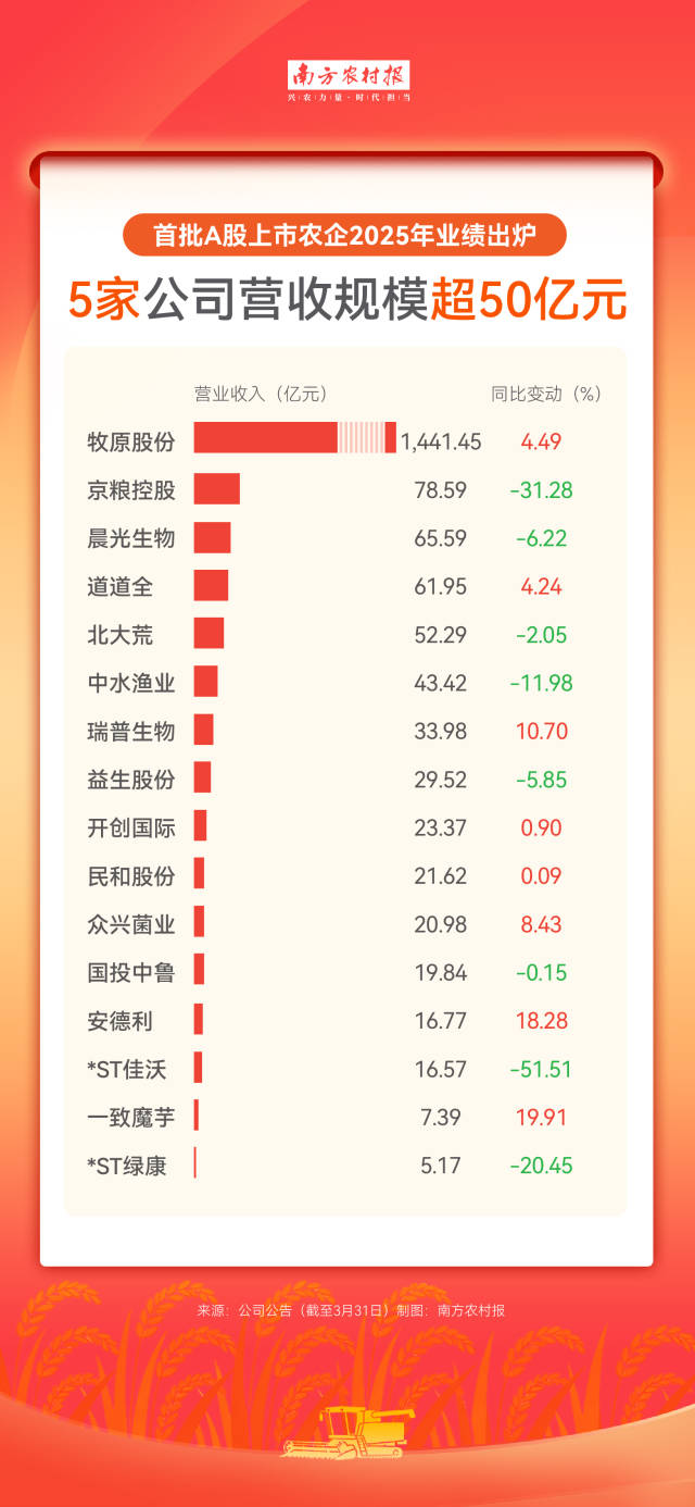 据记者统计,截至3月31日,A股农林牧渔行业已有16家企业披露2025年年报,营收与盈利呈现显著分化。