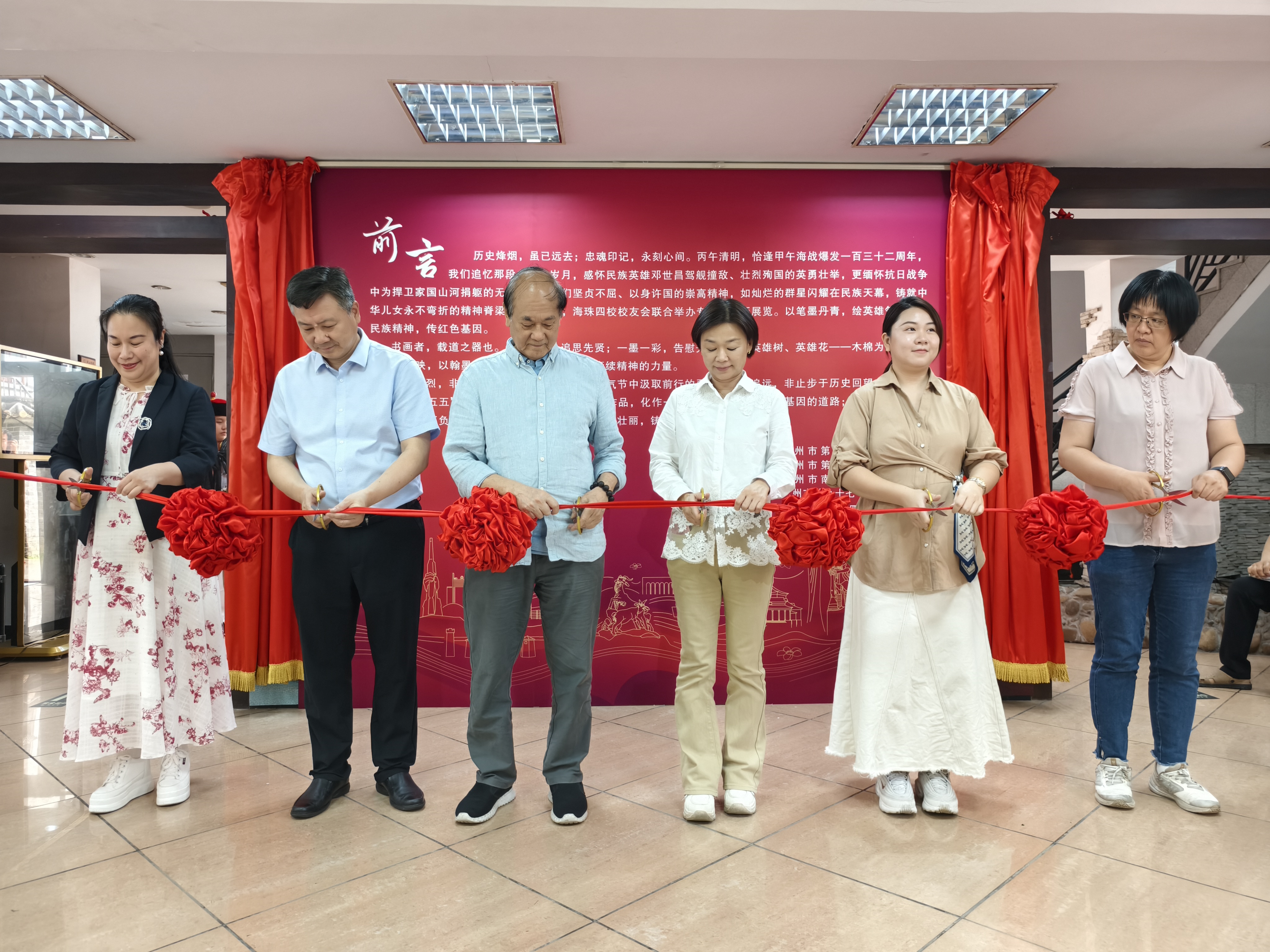 邓世昌纪念小学黄校长,书画家代表、民进会员陈飞行老师,邓氏后人,依次登台致辞致贺,邓世昌纪念小学学生表演情景剧《跨越时空的瞻仰》,海珠区委宣传部相关领导、书画家代表陈秋明、五中校长夏海波、南武中学党委书记陈碧宇、邓世昌后人代表为书画展揭幕剪彩。