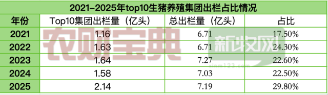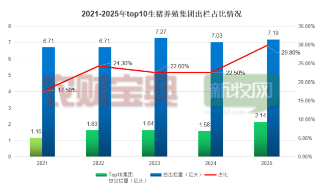 拉长时间线观察,2021年-2025年行业格局巨变。据新牧网调研数据,2025年,TOP10猪企出栏2.14亿头,较2021年增长84.5%。此外,国内生猪出栏TOP10企业的出栏总量占全国生猪出栏量的比例持续攀升,从2021年占比17.5%提升至2025年占比29.8%,头部企业的产能集聚效应形成压倒性优势。
