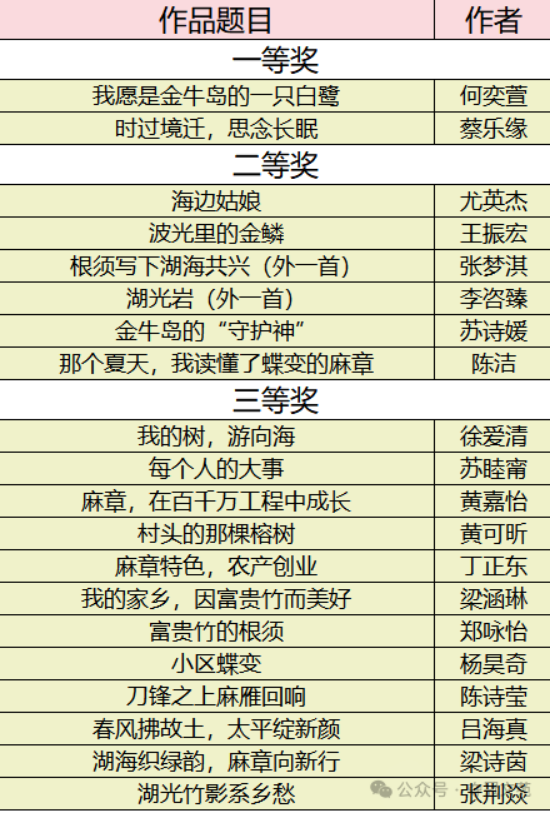 湛江市麻章区“百千万工程”主题征文活动由麻章区“百县千镇万村高质量发展工程”指挥部办公室指导,麻章区文学艺术界联合会、共青团麻章区委员会、麻章区教育局、麻章区融媒体中心主办,麻章区作家协会协办的“湖海绿韵 城乡共兴”——麻章区“百千万工程”主题征文活动获奖名单正式公布。征文活动以“湖海绿韵 城乡共兴”为核心主题,旨在以文学力量记录麻章城乡蝶变、生态焕新与民生改善,展现“百千万工程”的创新举措与丰硕成果,共收到全国各地来稿612篇(首),全程采用专家匿名评审模式,确保评审过程公平、公正、公开,彰显活动权威性。