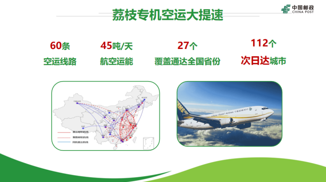 中国邮政集团广东省分公司副总经理郑双印“硬核” 提速清单,中国邮政开通了60条荔枝空运线路,覆盖全国27个省份,112个城市实现“次日达”。